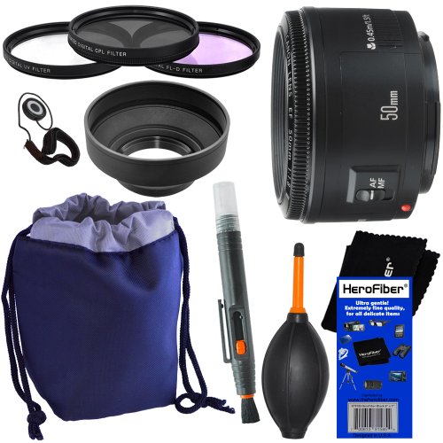 Lightweight and affordable, the Canon EF 50mm lens--which offers a fast f/1.8 aperture--is an excellent lens for people who prefer a fixed focal length. Canon's lightest EF lens at a mere 4.6 ounces, the lens boasts a traditional Gauss-type optical design that delivers a sharp performance even when wide open. As a result, the lens provides an image that's extremely close to how your eye perceives a subject, making it excellent for portraits and images that require a natural depth of field. In addition, the lens focuses as close as 18 inches, helping you take extreme close-ups. Finally, the lens offers an excellent color balance.Specifications: * Focal length: 50mm * Maximum aperture: 1:1.8 * Lens construction: 6 elements in 5 groupsDiagonal angle of view: 46 degrees * Focus adjustment: Overall linear extension system with Micromotor * Closest focusing distance: 1.5 feetFilter size: 52mm * Dimensions: 2.7 inches in diameter, 1.6 inches longWeight: 4.6 ounces.++PLUS++ 10pc Deluxe Accessory Kit:- UV (Ultraviolet) Protection Filter: protects the lens & reduces lens flare and ghosting caused by reflections- CPL (Circular Polarizer) Filter: Removes unwanted reflections from non-metallic surfaces, and lets you achieve vibrant color saturation- FL-D (Fluorescent) Filter: balances light in outdoor situations or where fluorescent lights are used- Filter case- Protective Pull String Closer Soft Lens Pouch- Soft Rubber Lens Hood (Prevents image-degrading lens flare by blocking stray light)- High Quality 2 in 1 Lens Cleaning Pen (brush & spray)- High Quality Dust Cleaner Blower (Excellent way to remove dust off sensitive camera parts without physical contact)- Universal Lens Cap Keeper- HeroFiber Ultra Gentle Cleaning Cloth.